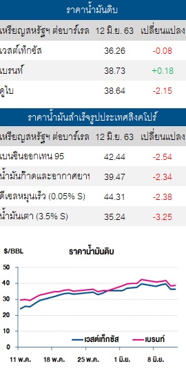 – ราคาน้ำมันดิบเวสต์เท็กซัสปรับลด หลังตัวเลขผู้ติดเชื้อโควิด-19 ทั่วโลกปรับสูงขึ้นแตะ 7.59 ล้านราย และตัวเลขผู้เสียชีวิตแตะ 4.2 แสนราย ขณะที่ตัวเลขผู้ติดเชื้อในสหรัฐฯ ปรับเพิ่มขึ้นต่อเนื่อง ส่งผลให้ตลาดกังวลว่าความต้องการใช้น้ำมันจะปรับตัวลดลง