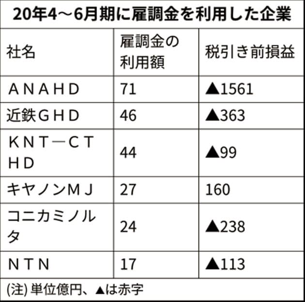 雇用を維持して従業員を休ませた企業を支援する雇用調整助成金(雇調金)が上場企業の業績を下支えしている。2020年4~6月期に雇調金などを計上したのは運輸や小売りなどを中心に136社で、合計額は462億円になった。政府は支援拡大を延長するが、雇調金を計上した一部の企業は人員削減に動いており、雇用維持が持続するか不透明感が漂う。