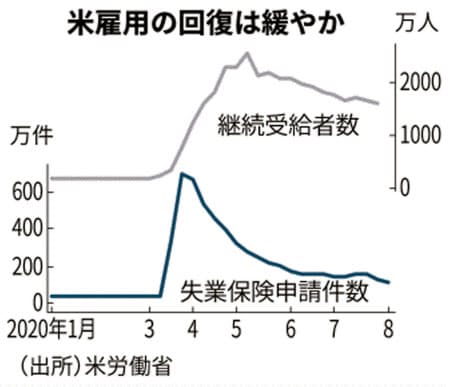 景気を下支えするために実施された失業保険給付金の上乗せは7月末で期限が切れた。トランプ政権と米議会はこの特例措置の復活を議論しているが、金額などで与野党が折り合わず、交渉は難航している。支えを失えば、景気回復が再び遅れる懸念がある。