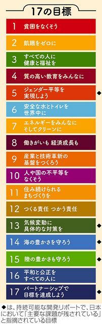 SDGs 2015年9月25日に国連総会で採択された。17目標とそれを具体化した169のターゲットから構成され「誰ひとり取り残さない」を基本理念とする。小・中・高校の新学習指導要領では「持続可能な社会の創り手」が目標に盛り込まれている。持続可能な開発ソリューションネットワークなどによる21年版持続可能な開発リポートで、日本のSDGs達成度は165カ国中18位。「ジェンダー平等を実現しよう」「気候変動に具体的な対策を」「海の豊かさを守ろう」「陸の豊かさも守ろう」「パートナーシップで目標を達成しよう」の5目標で「主要な課題が残されている」と指摘されている。
