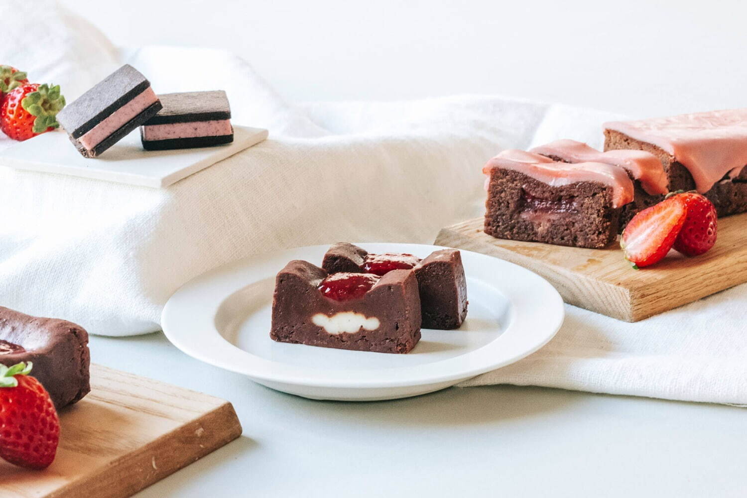カカオ豆から板チョコレートが完成するまでの全工程を自社の工房で管理する「ビーントゥバーチョコレート」を特徴とするミニマル。2022年バレンタインのテーマとして"苺"にフォーカスし、国内で約1%しか作られていない「女峰」という品種の苺を使ったガトーショコラなど、全3種のスイーツを取り揃えられています。