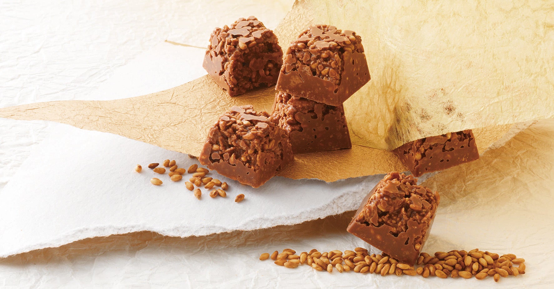 京都で丁寧に焙煎された炒り金ごまを、サクサクのフィアンティーヌ・砕いたアーモンドとあわせ、一口サイズのチョコレートにしました。金ごまは、職人がごまの香りが一番良くなる瞬間を逃さないよう丁寧に焙煎した香り豊かな炒りごまを選び、チョコレートは炒り金ごまの香りを引き立たせるため、カカオ感との味わいのバランスにこだわってブレンド。口に入れた瞬間から広がる炒り金ごまの香りとチョコレートとの組み合わせをお楽しみください。