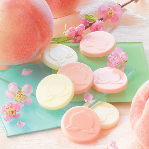 ストロベリーが香るチョコレートに白桃の味わいが広がる[白桃ベリー]と、ホワイトチョコレートが白桃の甘い香りを引き立てる[白桃ホワイト]の2種類のチョコレートをセットにしました。パッケージやチョコレートにも可愛らしい桃の絵柄が入った、一口サイズのチョコレートです。