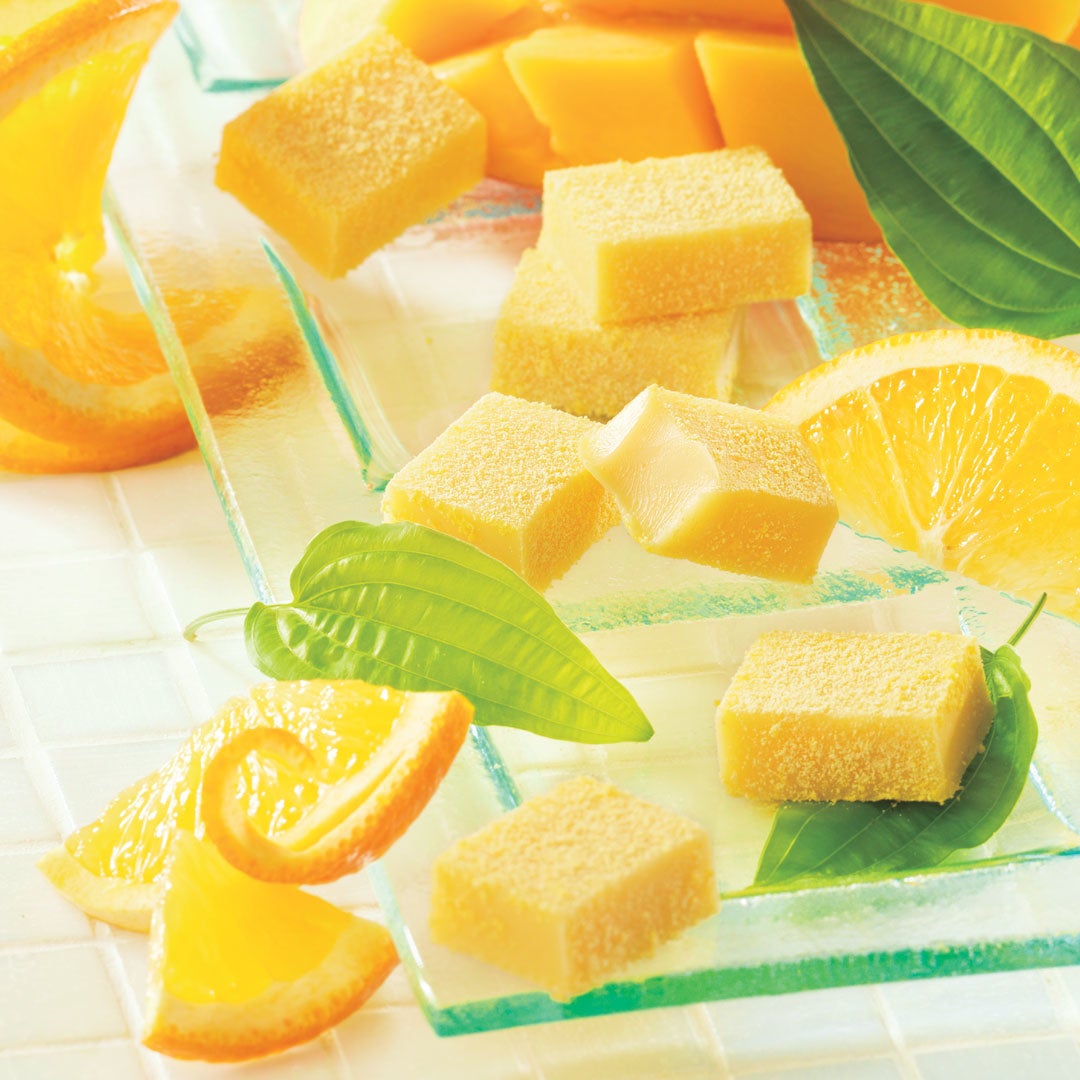 ホワイトチョコレートとマンゴーパウダーの入ったチョコレートをベースに、オレンジとマンゴーのピューレを合わせ、さらにオレンジリキュールでほのかに香り付けをしました。さわやかなオレンジの風味と、深みのあるマンゴーの豊かな甘みが、ホワイトチョコレートととけ合い口の中いっぱいに広がります。