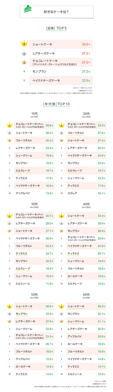 一方、40~60代では「ショートケーキ」がTOPで、特に50~60代で4割弱と高い割合です。