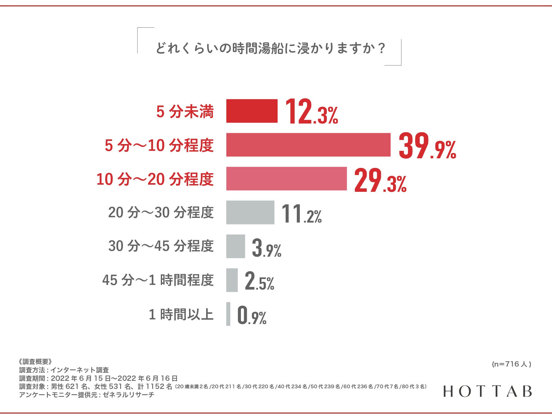 - 湯船に浸かっている時間は、10分以内が52.2%