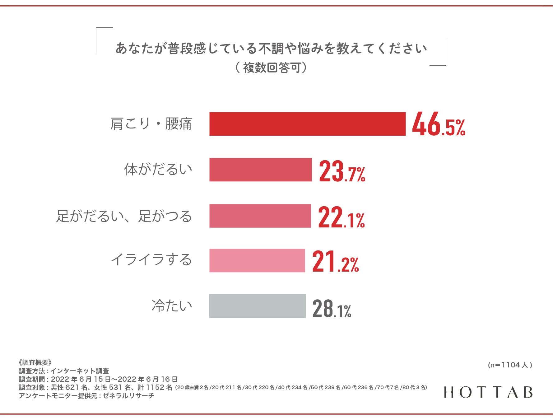 - 一般の方は肩こりや腰痛、だるさなどの何かしらの体の不調を感じていることがわかりました