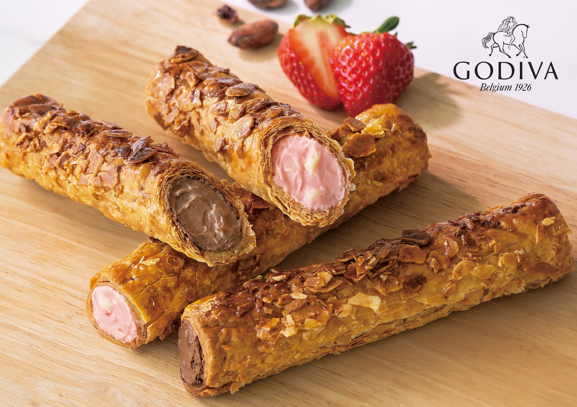 『ロングコルネ』は、お菓子の国たんぽぽオープンにあたって試行錯誤の末に開発された看板商品です。スライスアーモンドとフロランタンパウダーをふりかけ、オーブンで焼いたサクサクのパイに、口どけなめらかなクリームを絞った、冷凍なのにサクっとしたパイが楽しめる、これまでにない新感覚のスイーツ『ロングコルネ』とゴディバが出会いました。