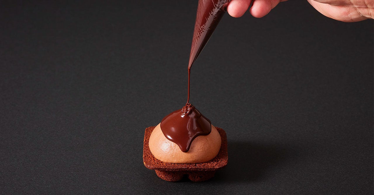 上掛けのチョコレートやムースに風味を合わせ、ハイカカオのクーベルチュールチョコレートを混ぜ込んでいます。