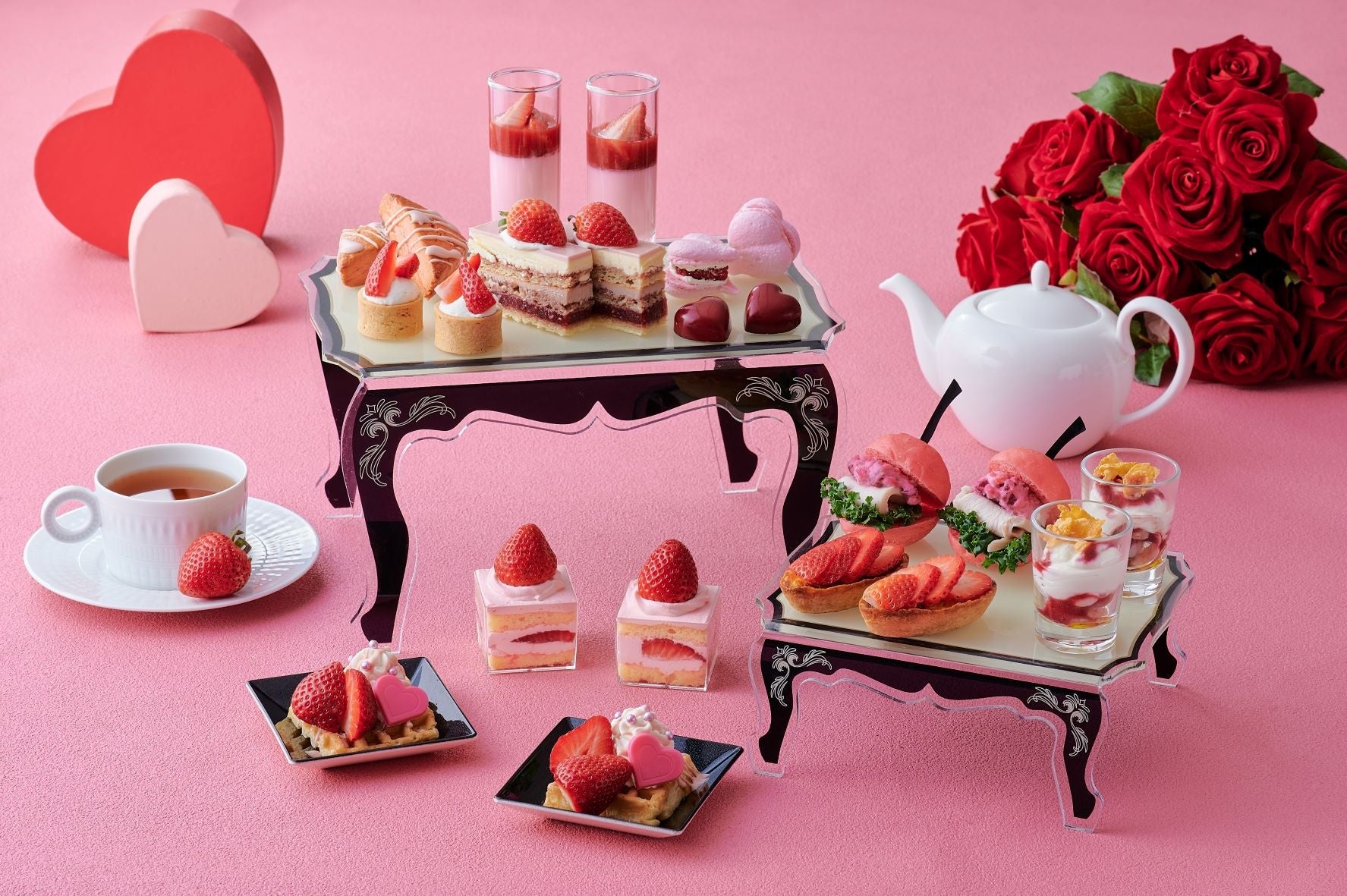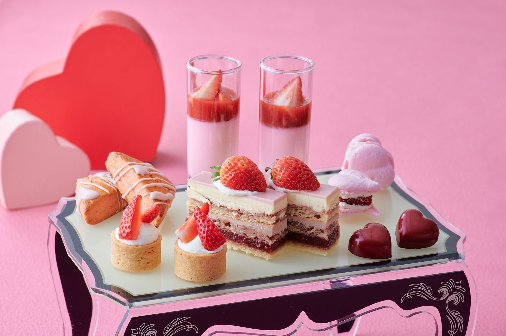 そのほかラズベリーを挟んだハート型のマカロンや、ボンボンショコラ、リッチな味わいのルビーチョコレートのオペラとスコーンも華やかに並ぶ、バレンタインのご利用にもおすすめのアフタヌーンティーです。