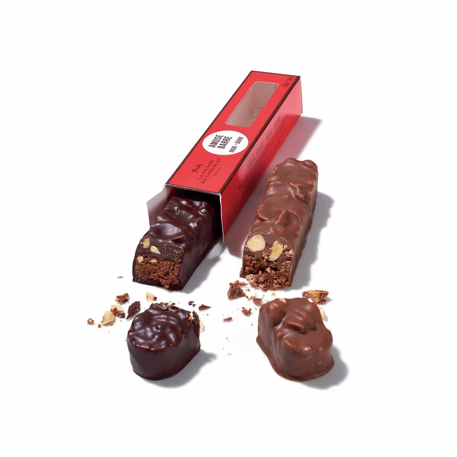 ミルク&ダークチョコレートをコーティングしたアーモンド&ヘーゼルナッツプラリネのバー。