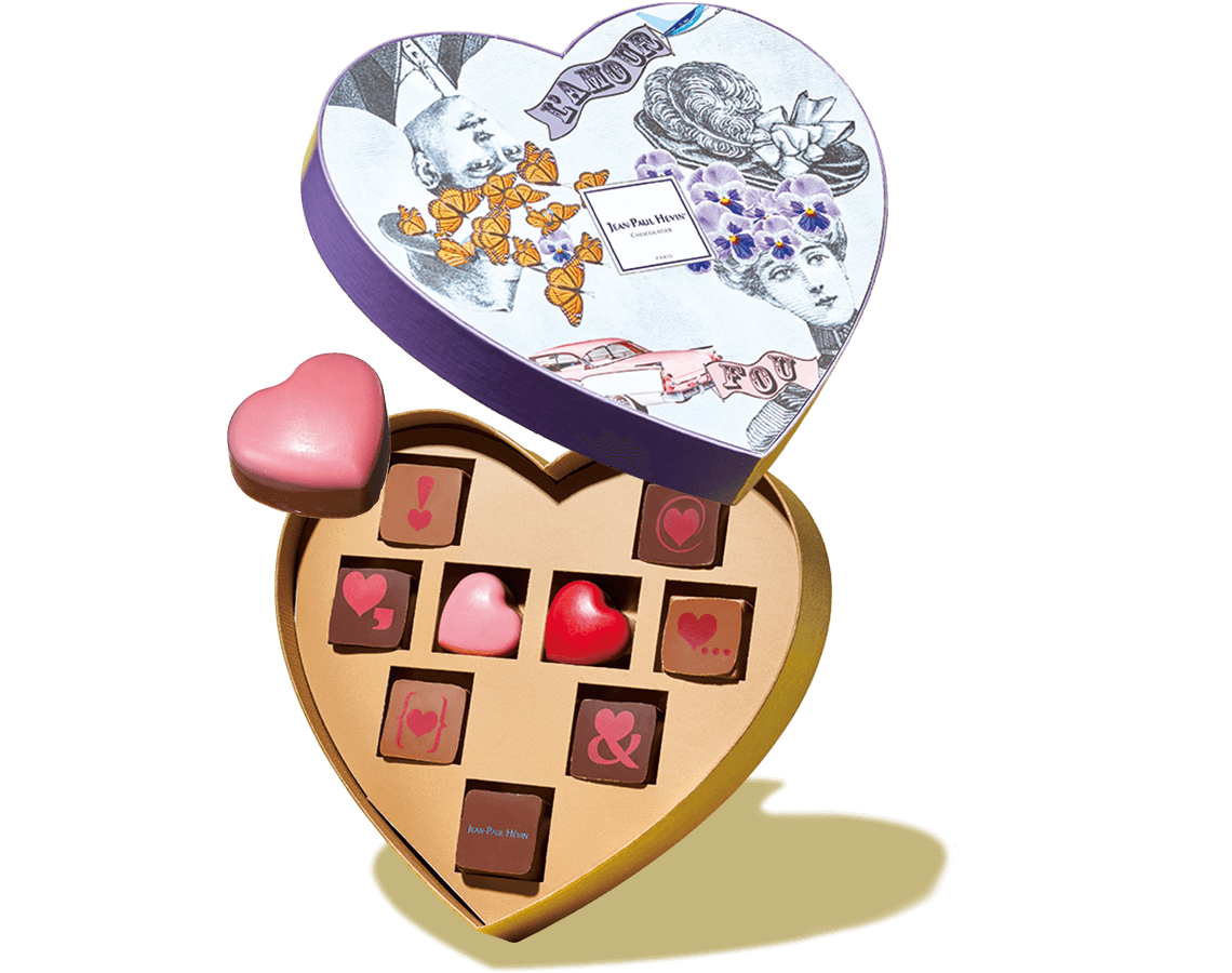 香ばしいプラリネが詰まったハート型のショコラ。オ・レとノワールの2種類をアソート。