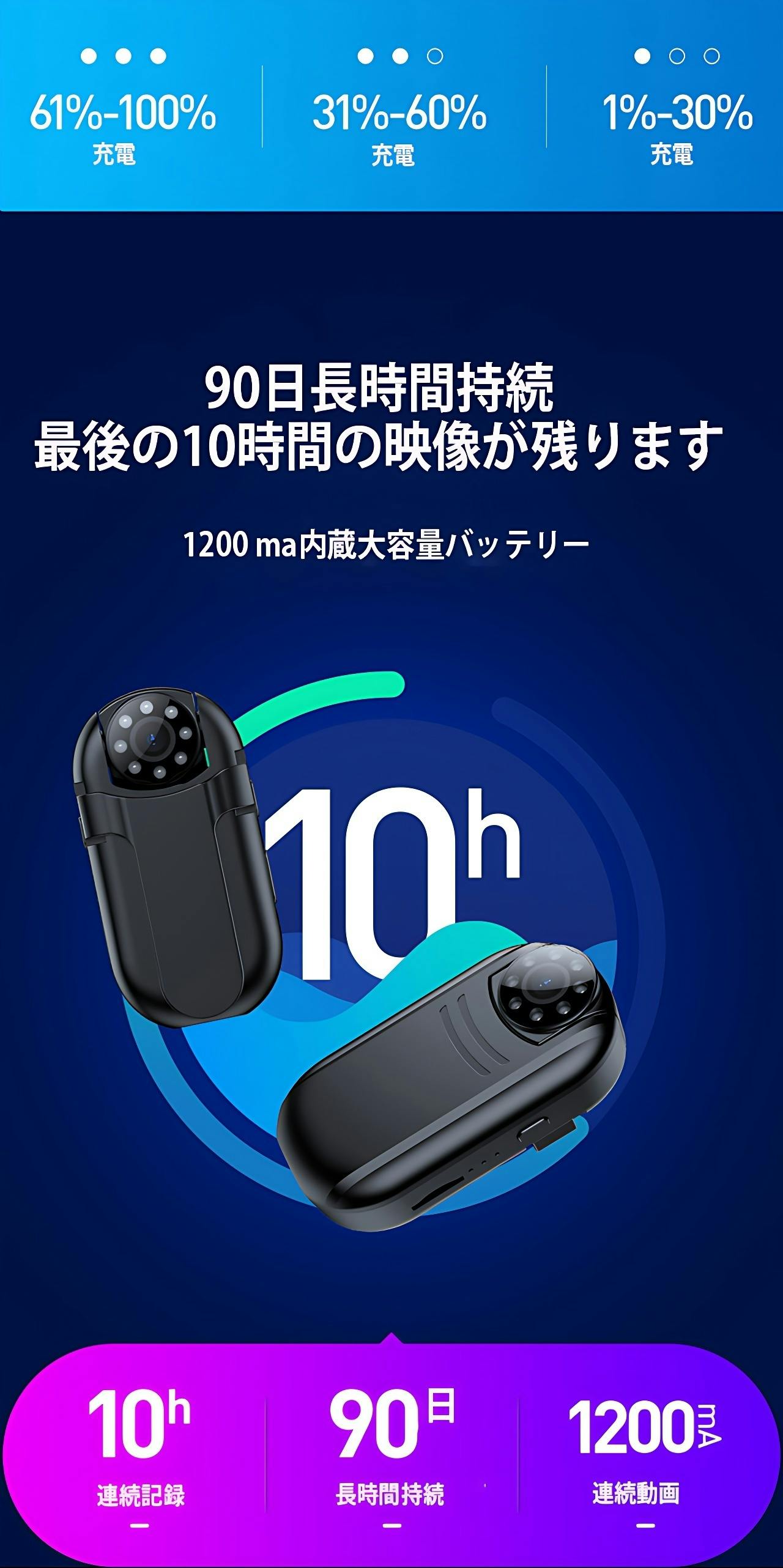 1200maの大容量のバッテリーを内蔵しているため10時間連続録画、電源が最大90日間持続可能です。