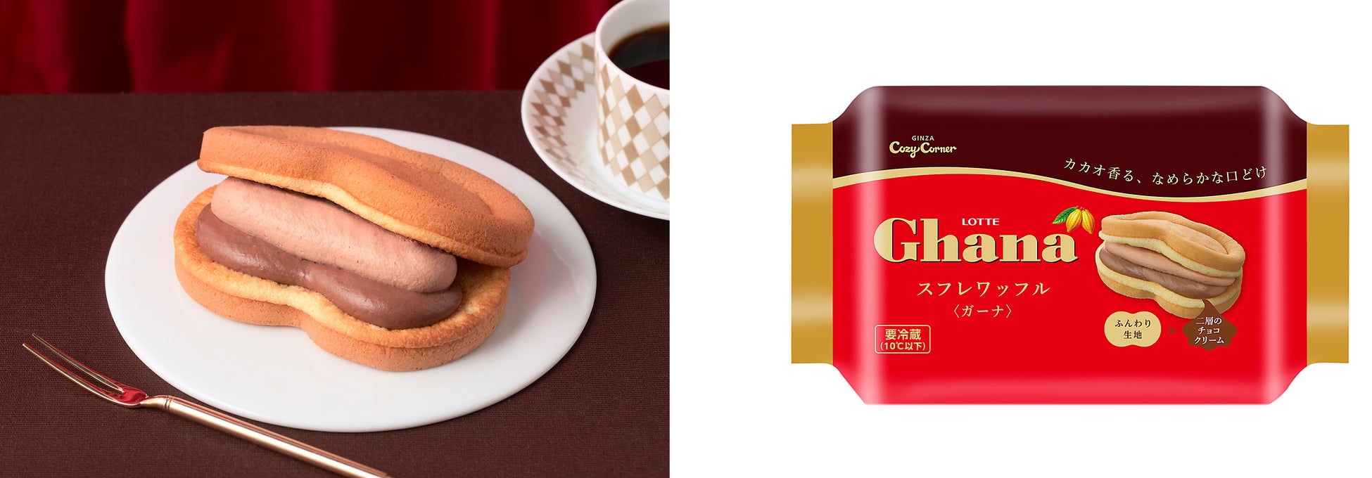 しっとり、ふんわり焼き上げたスフレのような軽い口どけのワッフル皮に「ガーナチョコレート」を使用した“チョコカスタード”と“チョコホイップ”を2層にサンド。下のチョコカスタードは、ミルク感の効いたコクのある味わいの「ガーナミルク」と、カカオの芳醇な香りとすっきりとした後味の「ガーナブラック」、カスタードをブレンド。カカオの酸味やほろにがさがミルクの優しい味わいを引き立てます。上のチョコホイップは「ガーナブラック」とホイップクリームをブレンド。深みのある、チョコレートのほどよいビター感が広がります。しっとり、ふんわり食感からあふれ出す「ガーナチョコレート」のおいしさをお楽しみください。