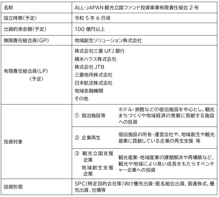 5.「ALL-JAPAN 観光立国ファンド2号」の概要(予定)本ファンドは、日本全国の活性化を通じて地域創生を目指すというALL-JAPAN 観光立国ファンドのこれまでの方針を維持しつつ、具体的には、ホテルなど宿泊施設の新規開発や運営、観光立国を支えるベンチャー企業や伝統産業の活性化サポートなど、地方創生における幅広いテーマを対象に取り組んでまいります。