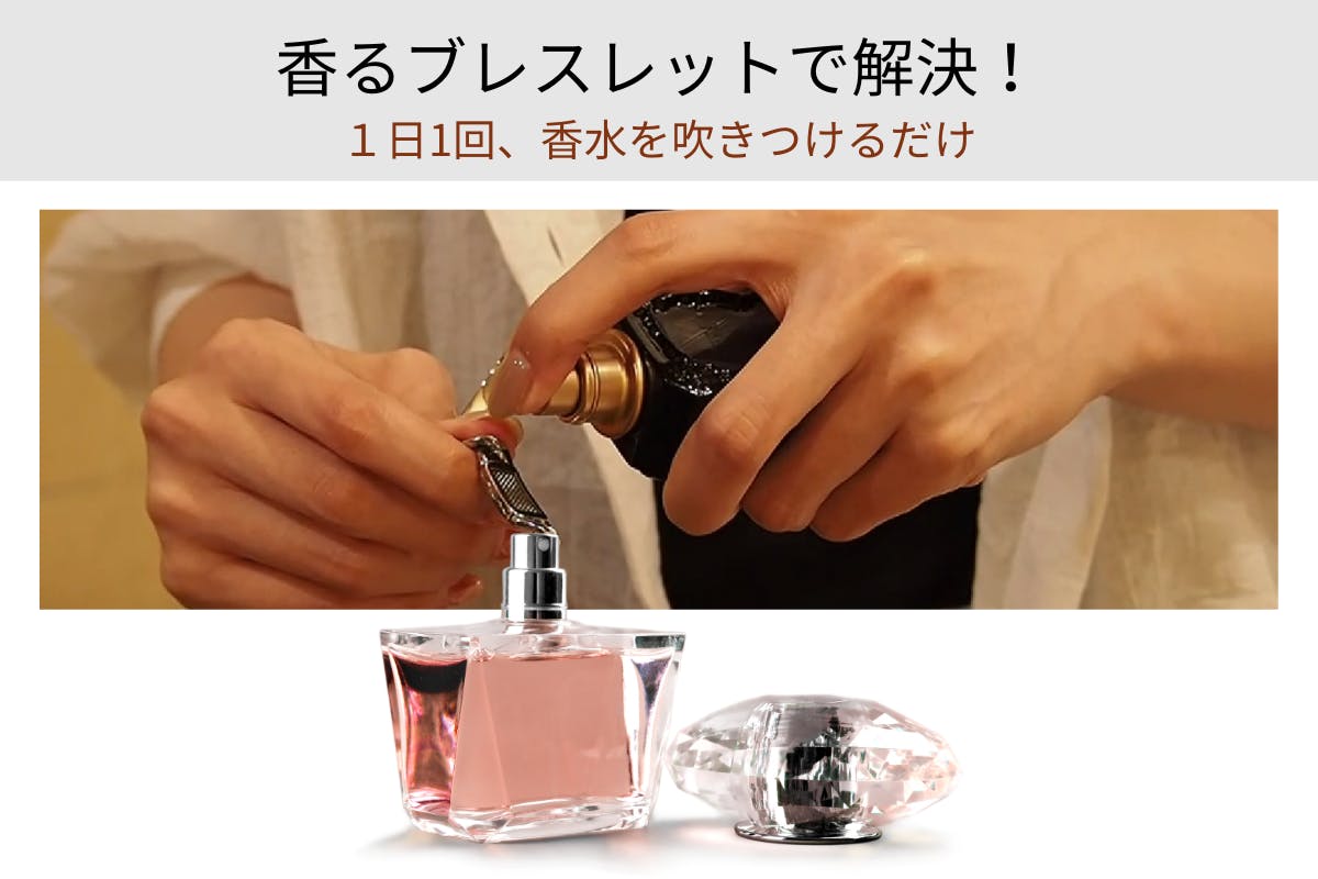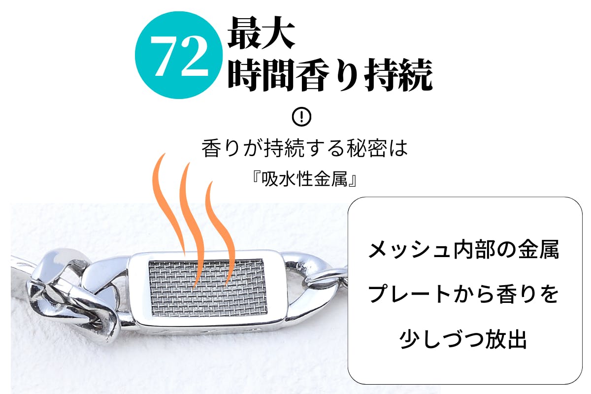 ブレスレット裏のメッシュ部分に、1日1回、香水を吹きつけるだけでブレスレットからほのかな香りが持続します。