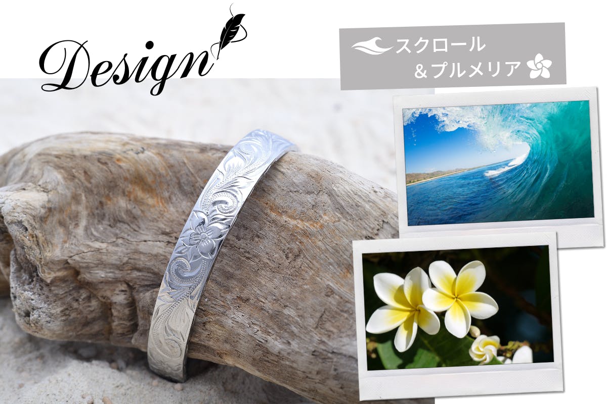 デザインはハワイアンジュエリーで波(スクロール)&プルメリア。ハワイアンジュエリーにはそれぞれ意味や言い伝えがある為お守りやプレゼントとして、とても人気があります。