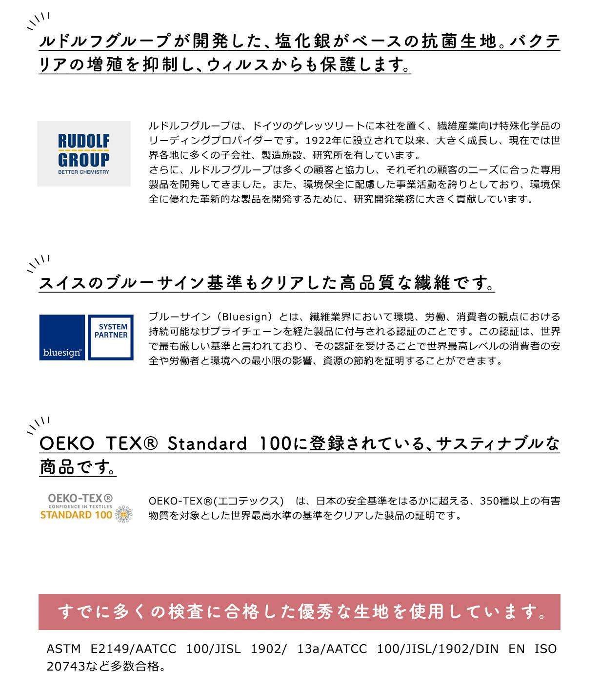 この生地には、塩化銀をベースにしたルドルフ社グループの活性物質RUCO®-BAC AGPが搭載されています。そのため、抗ウィルス・抗菌効果が半永久的に持続します。