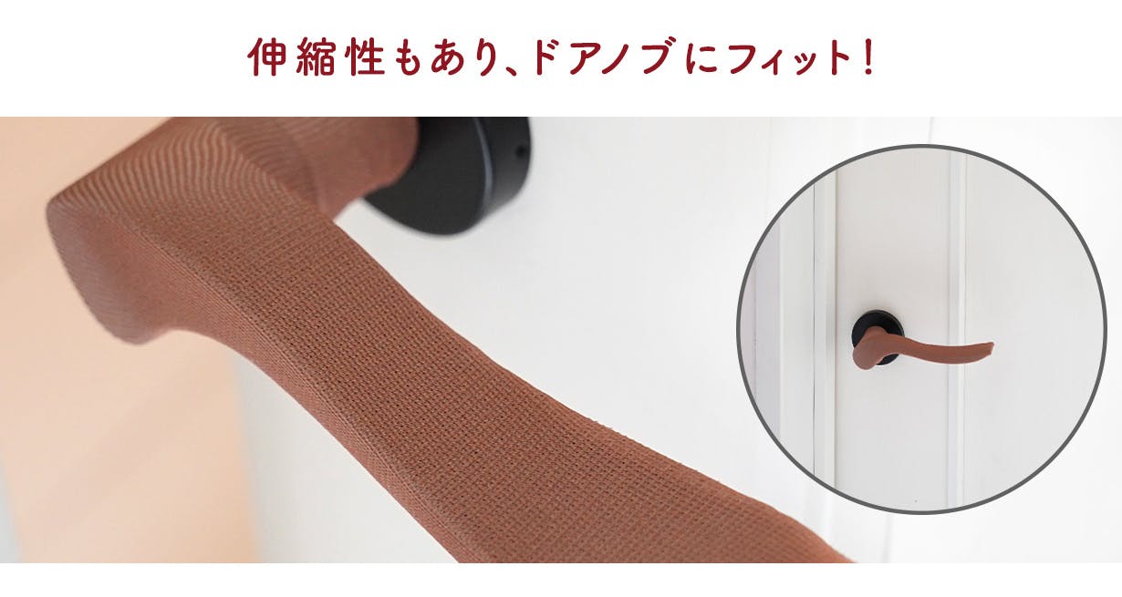 伸縮性のある生地がドアノブの形状にフィットするので、ごわつかず自然にハンドルを握れます。子どもからお年寄りまで快適にご使用いただけます。