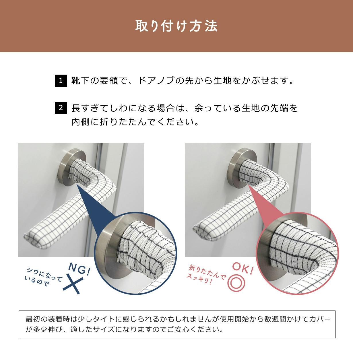 「InnolutionTex社のドアノブカバー」は、ポリエステルの生地でできており、伸縮性があるため、幅広いドアノブに対応します。ドアノブの外周は5~9cmの範囲で変更可能です。長さは21cmまでが目安です。ドアノブカバーが長い場合は、カバーを内側に折りたたみ、短く調整できます。