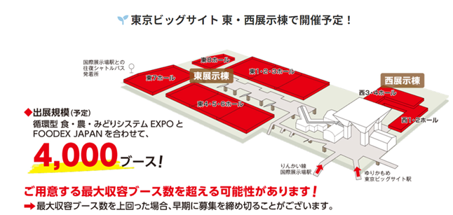 「みどりの食料システムEXPO」は「FOODEX JAPAN」との同時開催になります。日本とアジア、世界をつなぐ国際食品・飲料総合展示会とシームレスな(境界の無い)会場構成とすることで、食料生産の起点から販売・消費に至る、食に関わる全ての関係者が共働し、“ 食の新たな価値を創造する展示会”を目指します。例えば、生産物の出口となる商品化、6 次産業化のヒントが「FOODEX JAPAN」にあり、販売や消費の現場で発生する食品ロスの問題を解決するヒントが「みどりの食料システムEXPO」にあるため、同時開催によるクロスマッチングが実現します。
