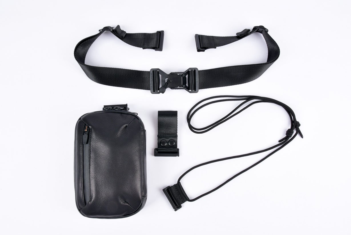 ウォータープルーフレザーミニバッグの機能面での一番の特長はストラップとバッグがアタッチメントで脱着出来ること。