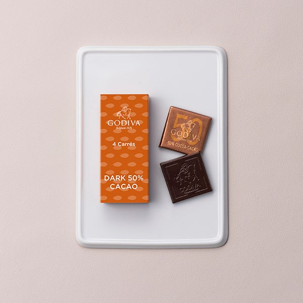 カカオ分50%、ほろ苦い甘さと香りをバランスよく楽しめるまろやかな味わいのダークチョコレートを、4枚詰め合わせました。