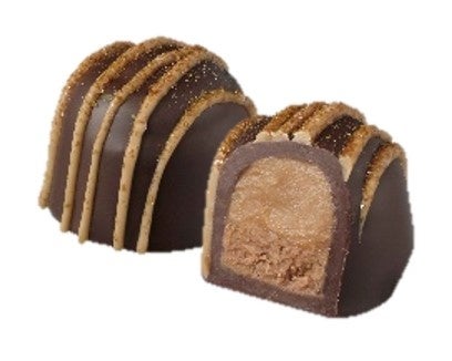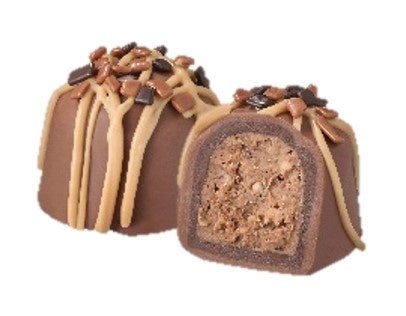 サクサクとしたピーカンナッツプラリネムースをミルクチョコレートで包み、ブロンドチョコレートのライン、ダークとミルクチョコレートのチップをトッピングしました。