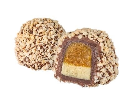 さくさくとした食感のフィユティーヌを加えたグラン マルニエ風味のアーモンドペーストに、オレンジガナッシュを重ね、ダークチョコレートで包みました。ラインとドライオレンジのフレークで装飾しました。