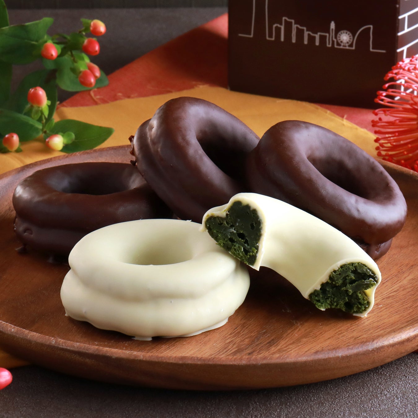数日間寝かせた生地を、揚げずに焼き上げた当店の「みなとみらいドーナツ」から期間限定の「抹茶」2個と定番の「チョコレート」3個がセットになって今年も登場。香り高い宇治抹茶を使用しホワイトチョコレートでコーティングしました。 |