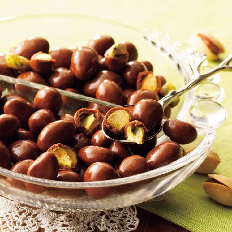 カリフォルニア産のピスタチオを、ミルクチョコレートでひと粒ずつコーティングしました。 ピスタチオ特有の食感と旨みが、すっきりとした味わいのチョコレートにベストマッチ。ついつい手が伸びてしまうおいしさです。