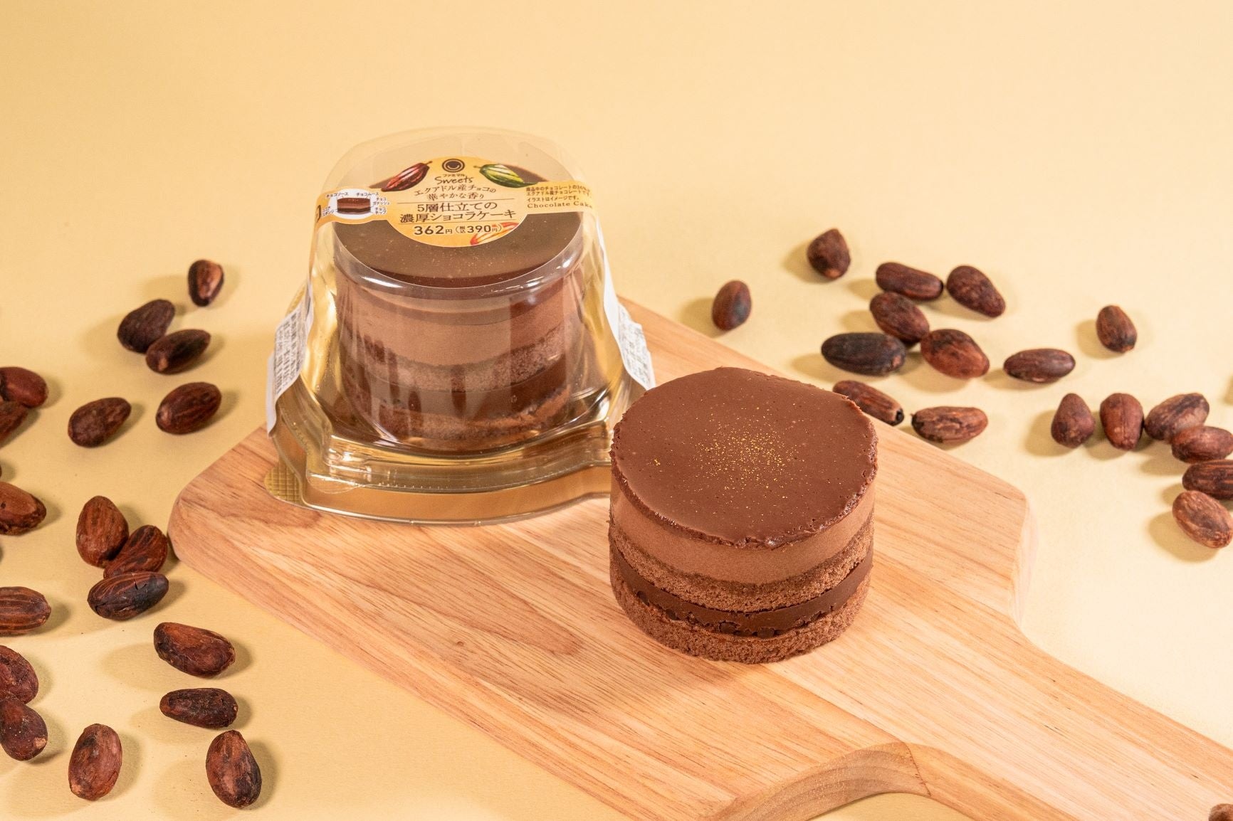 【内容】チョコガナッシュ、チョコムース、チョコソースに「エクアドル・スペシャル」をブレンドし、ココアスポンジを合わせた5層のチョコケーキです。アクセントとしてチョコチップを入れ、食感も楽しめるケーキになっています。