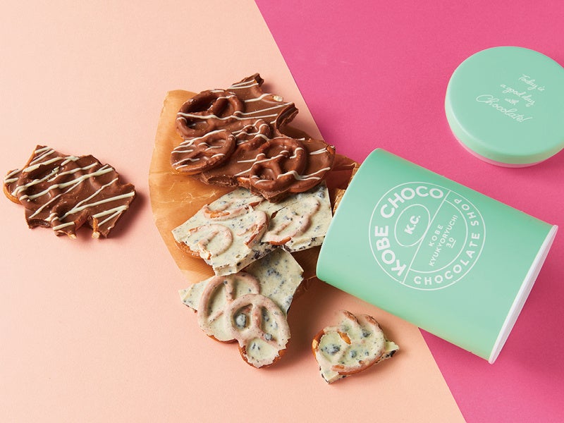お取り寄せ専門のオンラインショップとしてスタートし、2022年に神戸旧居留地に実店舗を構えたチョコレート専門店。人気のプレッツェル入り割チョコレート2種をアソート。チョコレートの甘さと塩をまぶしたプレッツェルとの相性は抜群。